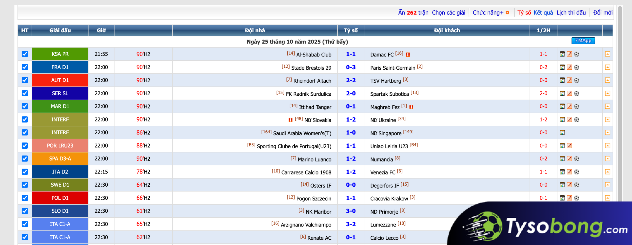• Tỷ số hiện tại: Cập nhật từng phút.